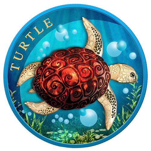 Sammlermünze Silber Schildkröte "Hawksbill Sea Turtle" von dem Hersteller Art Color Collection. Diese Meeresschildkröte wird vor allem in tropischen Meeren gefunden. Sie wird auch als echte Karettschildkröte bezeichnet.